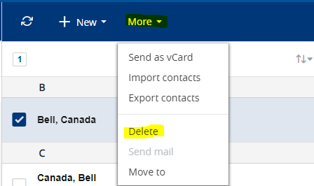 Within Bell Webmail under your contacts section you would need to check the box beside each contact you wish to remove. After you have selected the contacts, click on More and then click Delete and all the selected contacts will go into your trash.