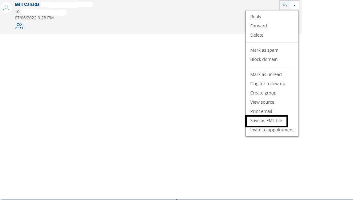 When using Bell webmail you can easily save an email message by selecting 'Save as EML file' under the dropdown menu within the email.
